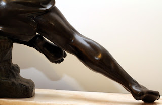 I am often surprised when I run across a gem in a most unexpected place. There is a large "Antiques Mall" about twenty minutes of country roads from me. I go there occasionally just for something to do other than wondering around dazed, trying to figure out who I am. It's one of those places that is huge and sprawling, with hundreds of shopkeepers who consign their "goods" to the headmaster at the front desk for commission. I am sure you know the places, where it looks like someones garage has thrown up all over the place. Gaudy junk and treasures yet to be recognized. One Saturday I was wondering around the place and from a half mile away I spotted this beautiful bronze sitting on a table at one seller's stall, which was replete with what looked like some quality European antiques (certainly out of context in this place). The closer I got the more my blood stirred. From those noble aquiline classic good looks, superman musculature, to that onyx stand this bronze was sitting on, this thing just screamed "Art Deco." I made a bee line up to the front desk and asked for more information. The proprietor shrugged and then went into a long story about the man who deposited that stuff in that stall, took off for Greece, and was two months late with his rent. Well I plunked down a deposit and headed for the Credit Union to negotiate a short term loan. The next day I went back and brought this beauty back to his new home. I even found a sturdy oak library table for him to repose on a couple of stalls down. I had my first bronze in my collection.